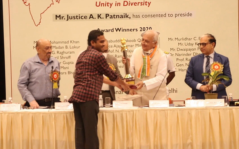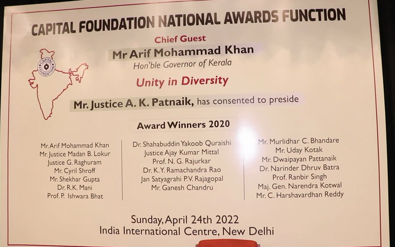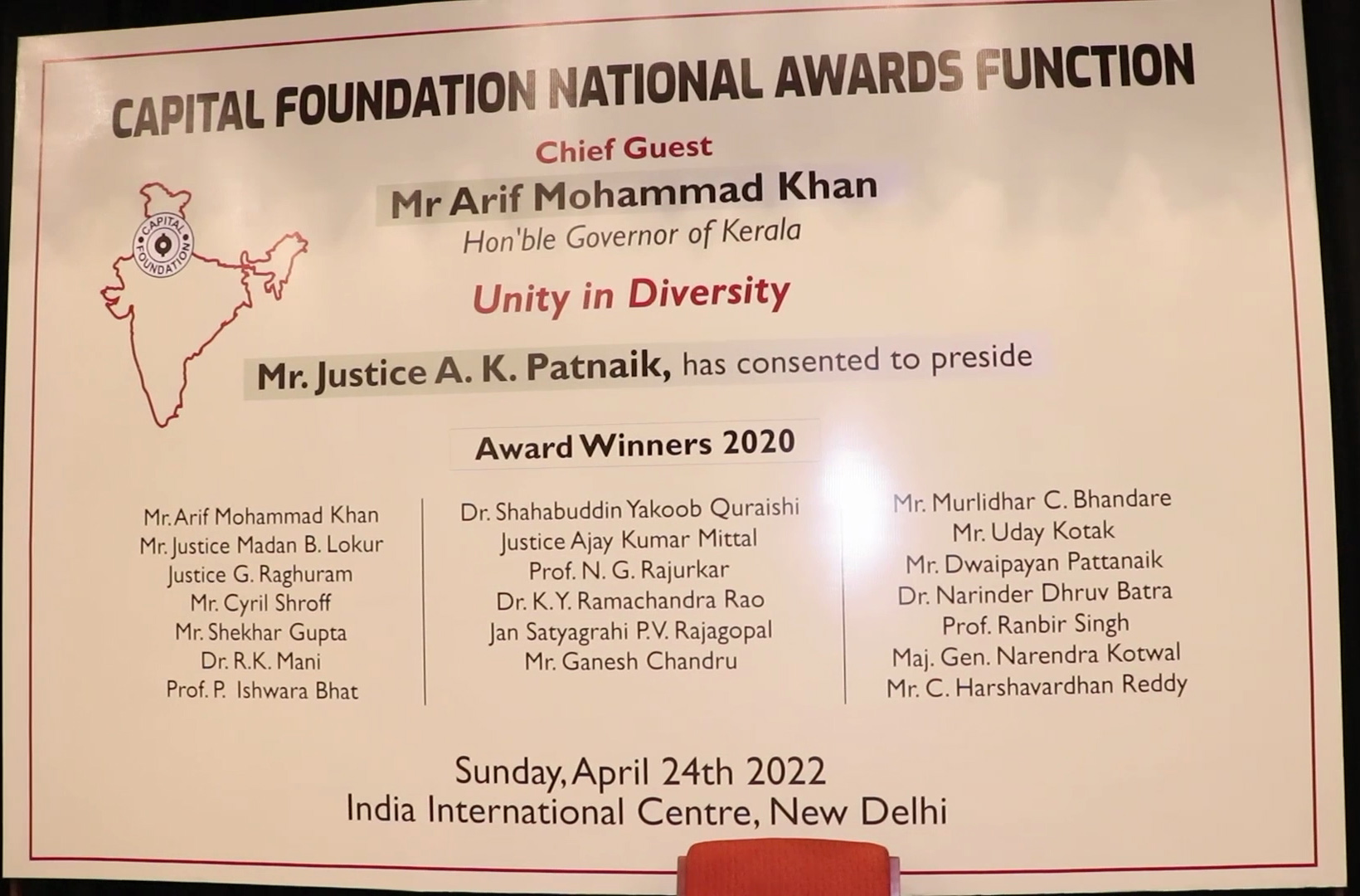 This award was instituted by Capital Foundation Society, New Delhi, and was presented to him by Shri Arif Mohammad Khan, Governor of Kerala, who was the chief guest of the ceremony, organized at India International Center (IIC) in New Delhi.